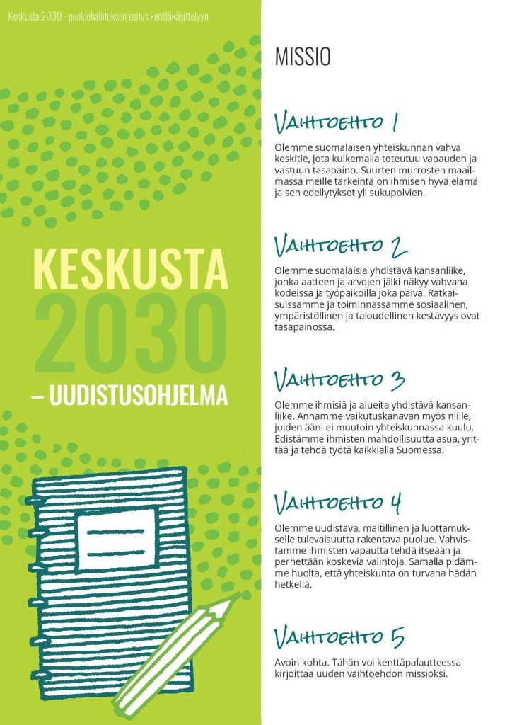 Ohjelman katse on tiukasti tulevaisuudessa. Se sisältää puolueen mission, vision Suomelle ja Keskustalle vuoteen 2030 sekä linjaa puolueen toimintatapojen uudistamista.