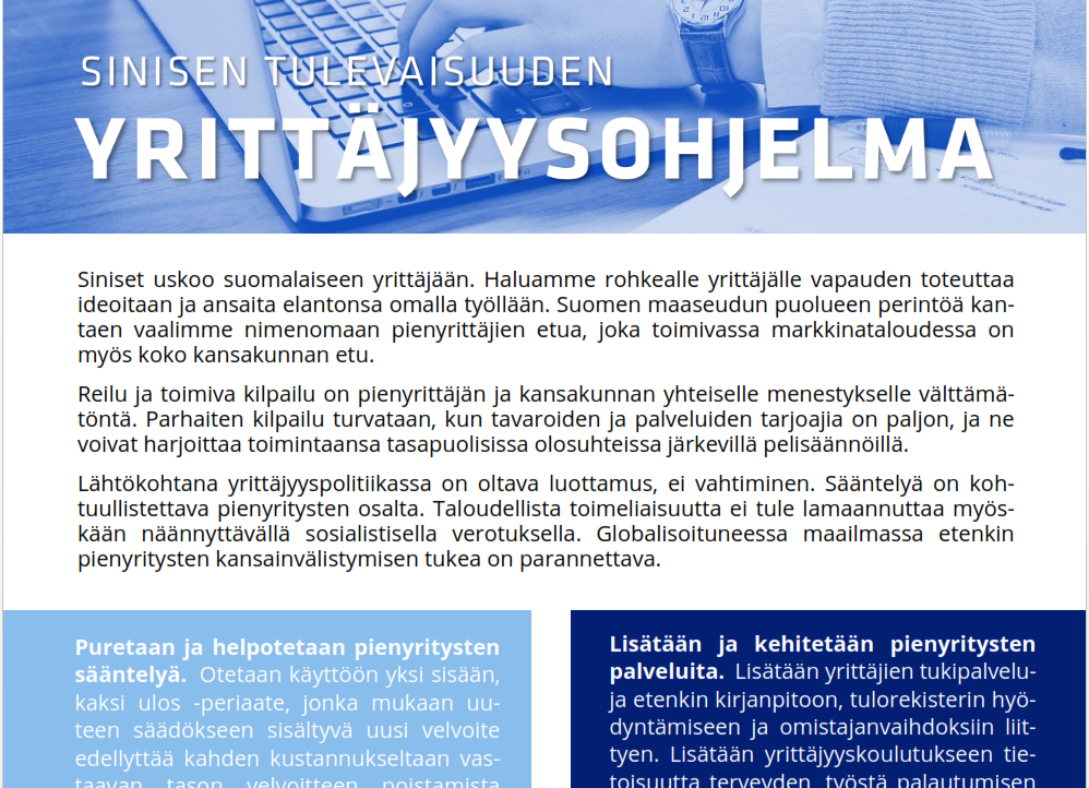 Modernilla pienyrittäjien puolueella on juuret syvällä maassa. Siniset jatkaa poliittista perintöä, joka alkoi jo Suomen Pientalonpoikien puolueesta, siis oman aikansa tavanomaisista pienyrittäjistä. On koko kansakunnan etu, että Suomessa on toimivat pienyrittäjien markkinat ja yritysten kasvu mahdollista kaikkialla maassa.